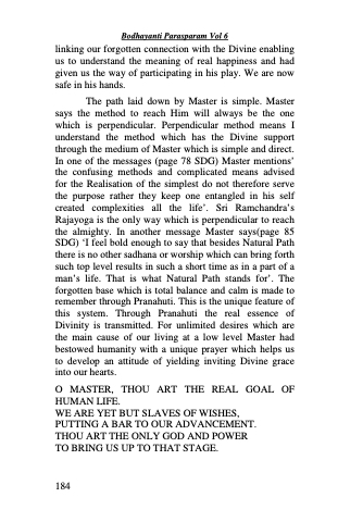 The path laid down by Master is simple. Master says the method to reach Him will always be the one which is perpendicular. Perpendicular method means I understand the method which has the Divine support through the medium of Master which is simple and direct. In one of the messages (page 78 SDG) Master mentions’ the confusing methods and complicated means advised for the Realisation of the simplest do not therefore serve the purpose rather they keep one entangled in his self created complexities all the life’. Sri Ramchandra’s Rajayoga is the only way which is perpendicular to reach the almighty. In another message Master says(page 85 SDG) ‘I feel bold enough to say that besides Natural Path there is no other sadhana or worship which can bring forth such top level results in such a short time as in a part of a man’s life. That is what Natural Path stands for’. The forgotten base which is total balance and calm is made to remember through Pranahuti. This is the unique feature of this system. Through Pranahuti the real essence of Divinity is transmitted. For unlimited desires which are the main cause of our living at a low level Master had bestowed humanity with a unique prayer which helps us to develop an attitude of yielding inviting Divine grace into our hearts.