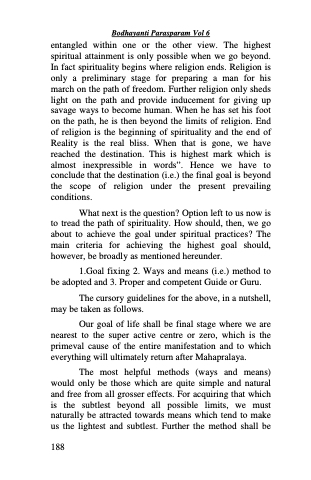 entangled within one or the other view. The highest spiritual attainment is only possible when we go beyond. In fact spirituality begins where religion ends. Religion is only a preliminary stage for preparing a man for his march on the path of freedom. Further religion only sheds light on the path and provide inducement for giving up savage ways to become human. When he has set his foot on the path, he is then beyond the limits of religion. End of religion is the beginning of spirituality and the end of Reality is the real bliss. When that is gone, we have reached the destination. This is highest mark which is almost inexpressible in words”. Hence we have to conclude that the destination (i.e.) the final goal is beyond the scope of religion under the present prevailing conditions.
