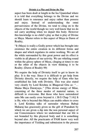 aspect has been dealt at length in the Isa Upanishad where it is told that everything belongs to the Divine and we should learn to renounce and enjoy rather than possess and enjoy. Instead of understanding the omni pervasiveness of the Divine, we tend to cling on to the objects of the world though we very well know that we do not carry anything when we depart this body. However this knowledge is no child’s play as that is play of Divine or Maya. Master refers to this aspect of Maya in Dawn of Reality,