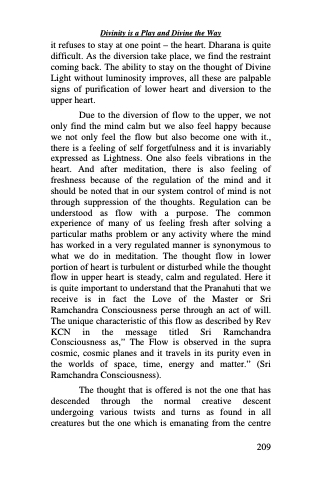 Due to the diversion of flow to the upper, we not only find the mind calm but we also feel happy because we not only feel the flow but also become one with it., there is a feeling of self forgetfulness and it is invariably expressed as Lightness. One also feels vibrations in the heart. And after meditation, there is also feeling of freshness because of the regulation of the mind and it should be noted that in our system control of mind is not through suppression of the thoughts. Regulation can be understood as flow with a purpose. The common experience of many of us feeling fresh after solving a particular maths problem or any activity where the mind has worked in a very regulated manner is synonymous to what we do in meditation. The thought flow in lower portion of heart is turbulent or disturbed while the thought flow in upper heart is steady, calm and regulated. Here it is quite important to understand that the Pranahuti that we receive is in fact the Love of the Master or Sri Ramchandra Consciousness perse through an act of will. The unique characteristic of this flow as described by Rev KCN in the message titled Sri Ramchandra Consciousness as,” The Flow is observed in the supra cosmic, cosmic planes and it travels in its purity even in the worlds of space, time, energy and matter.” (Sri Ramchandra Consciousness).