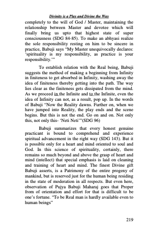 To establish relation with the Real being, Babuji suggests the method of making a beginning from Infinity in finiteness to get absorbed in Infinity, washing away the idea of finiteness thereby getting into the path. The way lies clear as the finiteness gets dissipated from the mind. As we proceed in the Infinite and to the Infinite, even the idea of Infinity can not, as a result, pop up. In the words of Babuji “Now the Reality dawns. Further on, when we have jumped into Reality, the play ends and the scene begins. But this is not the end. Go on and on. Not only this, not only this- ‘Neti Neti’”(SDG 96)
