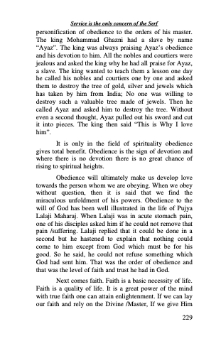Obedience will ultimately make us develop love towards the person whom we are obeying. When we obey without question, then it is said that we find the miraculous unfoldment of his powers. Obedience to the will of God has been well illustrated in the life of Pujya Lalaji Maharaj. When Lalaji was in acute stomach pain, one of his disciples asked him if he could not remove that pain /suffering. Lalaji replied that it could be done in a second but he hastened to explain that nothing could come to him except from God which must be for his good. So he said, he could not refuse something which God had sent him. That was the order of obedience and that was the level of faith and trust he had in God.