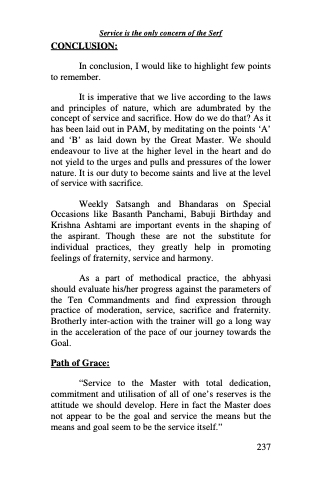 As a part of methodical practice, the abhyasi should evaluate his/her progress against the parameters of the Ten Commandments and find expression through practice of moderation, service, sacrifice and fraternity. Brotherly inter-action with the trainer will go a long way in the acceleration of the pace of our journey towards the Goal.