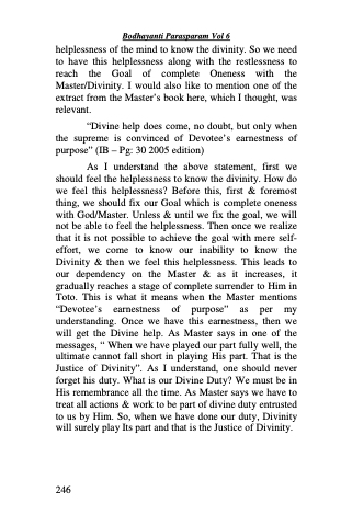 helplessness of the mind to know the divinity. So we need to have this helplessness along with the restlessness to reach the Goal of complete Oneness with the Master/Divinity. I would also like to mention one of the extract from the Master’s book here, which I thought, was relevant.