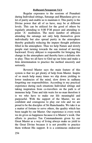 Regular exposures to the sessions of Pranahuti during Individual sittings, Satsangs and Bhandaras give us lot of purity and enable us to maintain it. This purity is the Divine power that all of us have, may be at different levels. This can be utilized for the good of others by regularly attending to 9.00 P.M prayer and attending to point ‘A’ meditation. The more number of abhyasis attending the satsangs not only help themselves grow individually but also spread purity in the atmosphere thereby gradually reducing the impure thought pollution filled in the atmosphere. Thus we help Nature and slowly people start turning towards the sun instead of moving backward. Every abhyasi is responsible for bringing this change in the atmosphere and thereby have a definite role to play. Thus we all have to Gird up our loins and make a firm determination to practice the method sincerely and seriously.