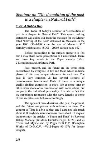 The Topic of today’s seminar is “Demolition of past is a chapter in Natural Path”. This epoch making statement was culled our from the message for the Master titled ‘Craving of the Soul’ delivered in Malaysia in the year 1981 (30-4-1981) on the eve of Master’s 82nd birthday celebrations. (SDG – 20005 edition page 162)