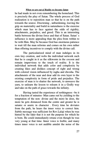 Having tasted the experience of nothingness –be it for a fraction of minutes- Man came out by yielding to the temptation of the non- divine and the more he does, the more he gets distanced from the centre and greater he is satanic or asuric in character . Every time he deviates from the path, he hears the inner voice to correct him. Subtle message was sufficient for Rev.Lalaji when he was hinted by the fakir that it is not the purpose for which he is born. He could immediately retune even though he was very young at that time. Inner voice is feeble, and many times inner voice is not audible amidst the noise of the