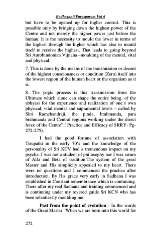 8. The yogic process is this transmission from the Ultimate which alone can shape the entire being, of the abhyasi for the experience and realization of one’s own physical, vital mental and supramental levels – called by Shri Ramchandraji, the pinda, brahmanda, para brahmanda and Central regions working under the direct force of the Centre”.( Practice and Efficacy of SRRY- Pg- 272-275).