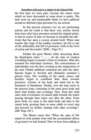 In this present existence too we are performing actions and the result is that these very actions slowly form layer after layer grossness around the original purity, so that in course of time we become to resemble the silk - worm that has spun a cocoon around itself. When man reaches this stage of his earthly existence, his life is one of the artificiality and full of grossness, both in the level of action and the results”.(SDG – Page 23 ).