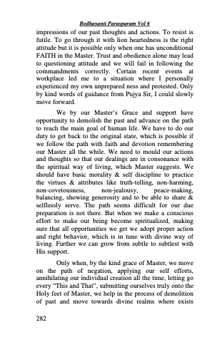 impressions of our past thoughts and actions. To resist is futile. To go through it with lion heartedness is the right attitude but it is possible only when one has unconditional FAITH in the Master. Trust and obedience alone may lead to questioning attitude and we will fail in following the commandments correctly. Certain recent events at workplace led me to a situation where I personally experienced my own unprepared ness and protested. Only by kind words of guidance from Pujya Sir, I could slowly move forward.