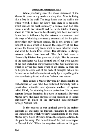 In the process of our spiritual growth the trainer supports us and helps us through Pranahuti to demolish the impediments which we have accumulated in the past. Master says ‘Once Divinity dawns the negative attitude to life goes far away. The demolition of the past is a chapter in Natural Path’. When the negative attitude to life goes