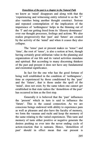 we know as ‘mind’ disappears and along with that the ‘experiencing and witnessing entity referred to as the ‘I’’ also vanishes being another thought construct. Serious and repeated contemplation of the implication of the imperience of ‘nothingness’ helps in the thinning out of the ‘I’ and our getting freed from its ‘illusory dominance’ over our thought processes, feelings and actions. We also realize progressively that ‘past’ and ‘future’ are created by the activity of the ‘mind’ and when it ceases they also collapse.