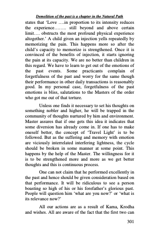 states that ‘Love ....in proportion to its intensity reduces the experience........ still beyond and above certain limit.... obstructs the most profound physical experience altogether.’ A child given an injection yells repeatedly by memorizing the pain. This happens more so after the child’s capacity to memorize is strengthened. Once it is convinced of the benefits of injection, it starts ignoring the pain at its capacity. We are no better than children in this regard. We have to learn to get out of the emotions of the past events. Some practicants complain of forgetfulness of the past and worry for the same though their performance in other daily transactions is reasonably good. In my personal case, forgetfulness of the past emotions is bliss, salutations to the Masters of the order who got me out of that torture.