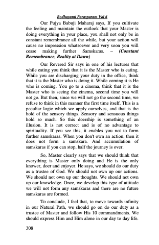 So, Master clearly says that we should think that everything is Master only doing and He is the only knower, doer and enjoyer. He says, we should do our duty as a trustee of God. We should not own up our actions. We should not own up our thoughts. We should not own up our knowledge. Once, we develop this type of attitude we will not form any samskaras and there are no future samskaras are formed.