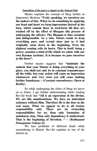 Master explains the concept of bhog further in Imperience Beckons “Truly speaking, we ourselves are the makers of fate. When we do something by applying our head and heart we form impressions thereof at the base, which remain there in seed-form till they are washed off by the effect of Bhogam (the process of undergoing the effects). The Bhogam is thus essential and indispensable. As a rule, Nature wants to keep everything pure and crystal clear just as it had originally come down in the beginning. Even the slightest coating veils its lustre. This in itself, being a power, assumes a kind of life which we relate with our own Karmas (actions). It is because we pose ourselves as the doers”.