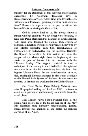 passport for the attainment of this supreme end of human endeavour. Sri Goswami Tulasidas says in Ramacharitamanasa “Rarely does God, who loves the Jiva without any self interest, graciously bestow on it a human from” Hence it is imperative on our part to utilize this human life for achieving the Goal of life.