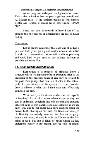 Demolition is a process of bringing down a structure which is supposed to be in existence prior to the initiation of the process; hence it can only be related to the past. Babuji says that this is a chapter in the natural path. As practitioners of the system, it is our bounden duty to adhere to what our Babuji says and effectively demolish the past.