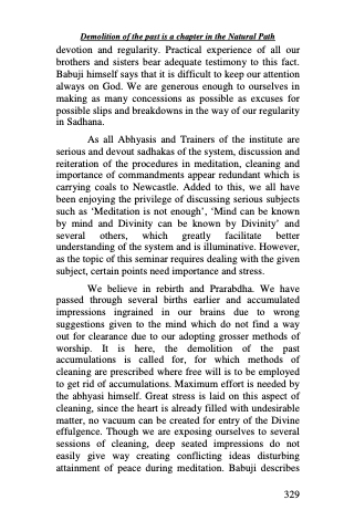 devotion and regularity. Practical experience of all our brothers and sisters bear adequate testimony to this fact. Babuji himself says that it is difficult to keep our attention always on God. We are generous enough to ourselves in making as many concessions as possible as excuses for possible slips and breakdowns in the way of our regularity in Sadhana.