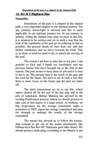 Demolition of the past is a chapter in the natural path, a very important chapter in our spiritual journey. For any journey, travel-light is advised and this is quite applicable in our spiritual journey too. In our journey to infinity, within the limited time span we have in this life, it is wisdom to be restless and act in such a way that the load of the samskaras of the past go on reducing as fast as possible; the present deeds of ours does not add any further samskaras; and we move towards the Goal. This is, in short, is what we need to do, to satisfy the craving of the soul.