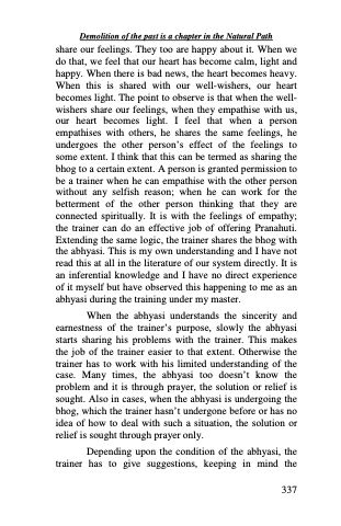 share our feelings. They too are happy about it. When we do that, we feel that our heart has become calm, light and happy. When there is bad news, the heart becomes heavy. When this is shared with our well-wishers, our heart becomes light. The point to observe is that when the well- wishers share our feelings, when they empathise with us, our heart becomes light. I feel that when a person empathises with others, he shares the same feelings, he undergoes the other person’s effect of the feelings to some extent. I think that this can be termed as sharing the bhog to a certain extent. A person is granted permission to be a trainer when he can empathise with the other person without any selfish reason; when he can work for the betterment of the other person thinking that they are connected spiritually. It is with the feelings of empathy; the trainer can do an effective job of offering Pranahuti. Extending the same logic, the trainer shares the bhog with the abhyasi. This is my own understanding and I have not read this at all in the literature of our system directly. It is an inferential knowledge and I have no direct experience of it myself but have observed this happening to me as an abhyasi during the training under my master.