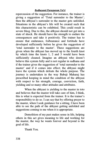 repercussion of the suggestion. For instance, the trainer is giving a suggestion of ‘Total surrender to the Master’; then the abhyasi’s surrender to the master gets unfolded. Situations in the abhyasi’s life will be created such that this characteristic can be exhibited. This could result in severe bhog. Due to this, the abhyasi should not get into a state of shock. He should have the strength to endure the consequences and take it positively. The trainer has to ensure that endurance, forbearance and fortitude have developed sufficiently before he gives the suggestion of ‘total surrender to the master’. These suggestions are given when the abhyasi has moved up to the fourth knot by which time the knots 1, 2 and 3 would have been sufficiently cleaned. Imagine an abhyasi who doesn’t believe this system fully and is not regular in sadhana and if the trainer gives the suggestion of ‘total surrender to the master’ and if it comes into effect; the abhyasi might leave the system which defeats the whole purpose. The journey is undertaken in the way Babuji Maharaj has prescribed keeping in mind the condition of the abhyasi with respect to his strength, courage, conviction, faith, yielding and so many other attitudes and attributes.