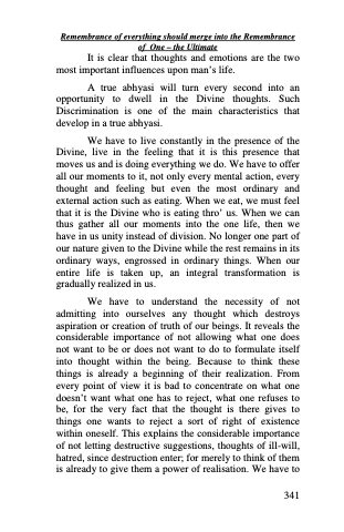 We have to live constantly in the presence of the Divine, live in the feeling that it is this presence that moves us and is doing everything we do. We have to offer all our moments to it, not only every mental action, every thought and feeling but even the most ordinary and external action such as eating. When we eat, we must feel that it is the Divine who is eating thro’ us. When we can thus gather all our moments into the one life, then we have in us unity instead of division. No longer one part of our nature given to the Divine while the rest remains in its ordinary ways, engrossed in ordinary things. When our entire life is taken up, an integral transformation is gradually realized in us.