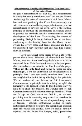 the gift of remembrance just like that. This remembrance is slowly but surely transforms into Love for the Master. Addressing the issue of remembrance and Love, Master has said very graciously that if you love somebody you will remember him and he says apply the inverse, practice remembrance to develop the Love. Love is the cardinal principle in spiritual life and therefore one should ensure to practice the methods and the commandments for the development of this Love. Transcending the borders of personality, Babuji Maharaj defines Love as the inner awakening to the Reality. Love for the Master in our system has a very broad and deeper meaning and has to be understood very carefully lest one may find oneself