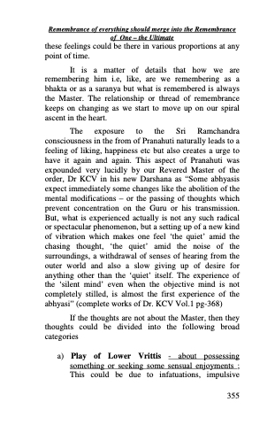 The exposure to the Sri Ramchandra consciousness in the from of Pranahuti naturally leads to a feeling of liking, happiness etc but also creates a urge to have it again and again. This aspect of Pranahuti was expounded very lucidly by our Revered Master of the order, Dr KCV in his new Darshana as “Some abhyasis expect immediately some changes like the abolition of the mental modifications – or the passing of thoughts which prevent concentration on the Guru or his transmission. But, what is experienced actually is not any such radical or spectacular phenomenon, but a setting up of a new kind of vibration which makes one feel ‘the quiet’ amid the chasing thought, ‘the quiet’ amid the noise of the surroundings, a withdrawal of senses of hearing from the outer world and also a slow giving up of desire for anything other than the ‘quiet’ itself. The experience of the ‘silent mind’ even when the objective mind is not completely stilled, is almost the first experience of the abhyasi” (complete works of Dr. KCV Vol.1 pg-368)
