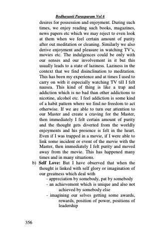 desires for possession and enjoyment. During such times, we enjoy reading such books, magazines, news papers etc which we may reject to even look at them when we feel certain amount of purity after out meditation or cleaning. Similarly we also derive enjoyment and pleasure in watching TV’s, movies etc. The indulgences could be only with our senses and our involvement in it but this usually leads to a state of laziness. Laziness in the context that we find disinclination to meditation. This has been my experience and at times I used to carry on with it especially watching TV till I felt nausea. This kind of thing is like a trap and addiction which is no bad than other addictions to nicotine, alcohol etc. I feel addiction is some kind of a habit pattern where we find no freedom to act otherwise. If we are able to turn our attention to our Master and create a craving for the Master, then immediately I felt certain amount of purity and the thought gets diverted from the worldly enjoyments and his presence is felt in the heart. Even if I was trapped in a movie, if I were able to link some incident or event of the movie with the Master, then immediately I felt purity and moved away from the movie. This has happened many times and in many situations.