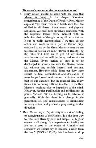 5. Rev. Master says,’ “spirituality is a sort of feeling or consciousness of the Highest. It is the door way to enter into Divinity pure and simple i.e. highest evenness all along. In comparison to Reality we are but a drop in the ocean of Almighty and somehow we should try to become a river from the drop”. (SDG – 157) By this I understand drop