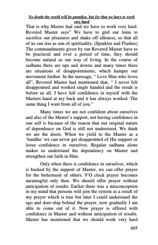 Only when there is confidence in ourselves, which is backed by the support of Master, we can offer prayer for the betterment of others. 9’O clock prayer becomes meaningful only then. We should offer prayer without anticipation of results. Earlier there was a misconception in my mind that persons will join the system as a result of my prayer which is true but later I could understand the ego and doer-ship behind the prayer, now gradually I am able to come out of it. Now prayer is offered with confidence in Master and without anticipation of results. Master has mentioned that we should work very hard