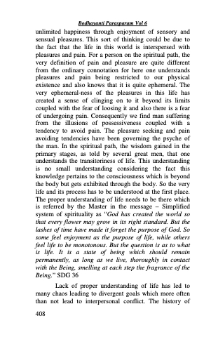 unlimited happiness through enjoyment of sensory and sensual pleasures. This sort of thinking could be due to the fact that the life in this world is interspersed with pleasures and pain. For a person on the spiritual path, the very definition of pain and pleasure are quite different from the ordinary connotation for here one understands pleasures and pain being restricted to our physical existence and also knows that it is quite ephemeral. The very ephemeral-ness of the pleasures in this life has created a sense of clinging on to it beyond its limits coupled with the fear of loosing it and also there is a fear of undergoing pain. Consequently we find man suffering from the illusions of possessiveness coupled with a tendency to avoid pain. The pleasure seeking and pain avoiding tendencies have been governing the psyche of the man. In the spiritual path, the wisdom gained in the primary stages, as told by several great men, that one understands the transitoriness of life. This understanding is no small understanding considering the fact this knowledge pertains to the consciousness which is beyond the body but gets exhibited through the body. So the very life and its process has to be understood at the first place. The proper understanding of life needs to be there which is referred by the Master in the message – Simplified system of spirituality as “God has created the world so that every flower may grow in its right standard. But the lashes of time have made it forget the purpose of God. So some feel enjoyment as the purpose of life, while others feel life to be monotonous. But the question is as to what is life. It is a state of being which should remain permanently, as long as we live, thoroughly in contact with the Being, smelling at each step the fragrance of the Being.” SDG 36