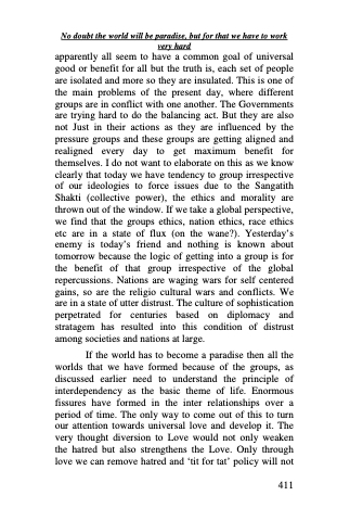 If the world has to become a paradise then all the worlds that we have formed because of the groups, as discussed earlier need to understand the principle of interdependency as the basic theme of life. Enormous fissures have formed in the inter relationships over a period of time. The only way to come out of this to turn our attention towards universal love and develop it. The very thought diversion to Love would not only weaken the hatred but also strengthens the Love. Only through love we can remove hatred and ‘tit for tat’ policy will not