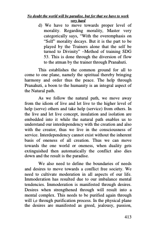 d) We have to move towards proper level of morality. Regarding morality, Master very categorically says, “With the overemphasis on “Self” morality decays. But it is the part to be played by the Trainers alone that the self be turned to Divinity” –Method of training SDG 53. This is done through the diversion of flow to the atman by the trainer through Pranahuti.