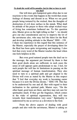 But even good natured people turn the deaf ear to the message, the argument put forward by them is that their good deeds alone are sufficient, in such cases the sense of self appears quite predominant to me. I feel, for such people the will has its limitations in passing on the spiritual message of human transformation. They also need to turn to a spiritual path and get aligned to the Divine will even as stated by the Master in this respect that “I feel that everyday my work is becoming easier because it is now the Divine dictate..” SDG 158. This has to be understood by one and all. But with regard to their inclination to the spiritual path, Master says, “On the other hand, good men are there, and they may not care for spirituality much. If they get the fragrance, which comes in the wake of spiritual regeneration, they will rise towards their transformation very soon.” Spirituality is understood by me as service as a devotion to the God.
