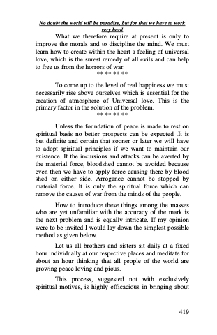 Unless the foundation of peace is made to rest on spiritual basis no better prospects can be expected .It is but definite and certain that sooner or later we will have to adopt spiritual principles if we want to maintain our existence. If the incursions and attacks can be averted by the material force, bloodshed cannot be avoided because even then we have to apply force causing there by blood shed on either side. Arrogance cannot be stopped by material force. It is only the spiritual force which can remove the causes of war from the minds of the people.