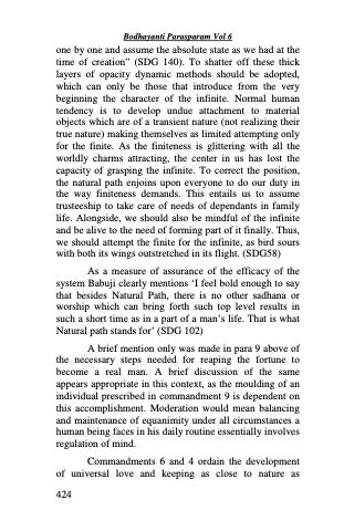 one by one and assume the absolute state as we had at the time of creation” (SDG 140). To shatter off these thick layers of opacity dynamic methods should be adopted, which can only be those that introduce from the very beginning the character of the infinite. Normal human tendency is to develop undue attachment to material objects which are of a transient nature (not realizing their true nature) making themselves as limited attempting only for the finite. As the finiteness is glittering with all the worldly charms attracting, the center in us has lost the capacity of grasping the infinite. To correct the position, the natural path enjoins upon everyone to do our duty in the way finiteness demands. This entails us to assume trusteeship to take care of needs of dependants in family life. Alongside, we should also be mindful of the infinite and be alive to the need of forming part of it finally. Thus, we should attempt the finite for the infinite, as bird sours with both its wings outstretched in its flight. (SDG58)