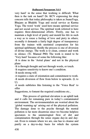 very hard’ in the sense that working is difficult. What then is the task on hand? Dr. KCV expressing his deep concern tells that today philosophy is taken as JnanaYoga, Bhajans as Bhakthi Yoga and social service as Karma Yoga. The word ‘work’ used here means spiritual service and not social service. The spiritual work referred to here requires three-dimensional efforts. Firstly, one has to maintain a high level of purity and mould his life in such a way as to rouse a feeling of love and piety in others; secondly it demands a fairly high degree of transparency from the trainee with unstinted cooperation for his spiritual upliftment; thirdly the process is one of diversion of divine energy. The work is to clean, connect and work in silence. (Tr. Manual P60) The work is stated to be ‘Very hard’ because of some the following like:
