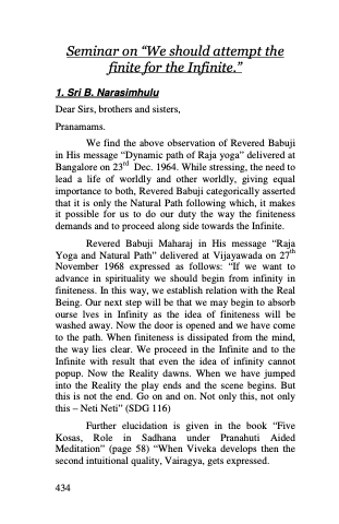 Revered Babuji Maharaj in His message “Raja Yoga and Natural Path” delivered at Vijayawada on 27th November 1968 expressed as follows: “If we want to advance in spirituality we should begin from infinity in finiteness. In this way, we establish relation with the Real Being. Our next step will be that we may begin to absorb ourse lves in Infinity as the idea of finiteness will be washed away. Now the door is opened and we have come to the path. When finiteness is dissipated from the mind, the way lies clear. We proceed in the Infinite and to the Infinite with result that even the idea of infinity cannot popup. Now the Reality dawns. When we have jumped into the Reality the play ends and the scene begins. But this is not the end. Go on and on. Not only this, not only this – Neti Neti” (SDG 116)