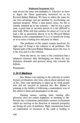 man invests the same and multiplies it. Likewise we have to digest the Grace generously bestowed on us by Revered Babuji Maharaj. We have to utilize the same for our best advantage and get profited by accelerating our spiritual progress. When a man passes away, his life is usually summed up in one sentence – that he was a great man, a good man or sarcastic person or a one difficult to deal with. What will that sentence be about us? Let us all lead a life as graciously shown to us by Revered Babuji Maharaj in His commandment 9 (i.e.) to mould our living so as to rouse a feeling love and piety in others.