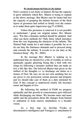 Unless this grossness is removed it is not possible to understand / grasp our original nature. Rev Master says, “For this a dynamic method should be adopted. And what can those methods be? Only those which introduce from the very beginning the character of the infinite. The Natural Path stands for it and makes it possible for us to do our duty the finiteness demands and to proceed along side towards the infinite. It reveals to us our duty as the foremost thing”. (Pg. 58 – SDG)