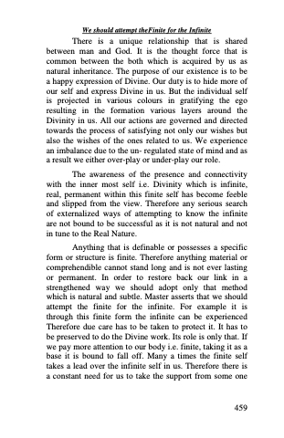 Anything that is definable or possesses a specific form or structure is finite. Therefore anything material or comprehendible cannot stand long and is not ever lasting or permanent. In order to restore back our link in a strengthened way we should adopt only that method which is natural and subtle. Master asserts that we should attempt the finite for the infinite. For example it is through this finite form the infinite can be experienced Therefore due care has to be taken to protect it. It has to be preserved to do the Divine work. Its role is only that. If we pay more attention to our body i.e. finite, taking it as a base it is bound to fall off. Many a times the finite self takes a lead over the infinite self in us. Therefore there is a constant need for us to take the support from some one
