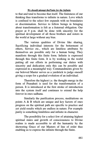 The various qualities of Divine like sharing, Sacrificing individual interests for the betterment of others, Service etc., which are limitless attributes by themselves are possible only for a human being. They manifests through this finite form. Infinite is expressed through this finite form. It is by working in the world putting all our efforts in performing our duties with sincerity and dedication only this can be possible and expressed in a meaningful way. Commandments given by our beloved Master serves as a yardstick to judge oneself giving a scope for a gradual evolution of an individual.