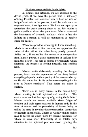 'There are so many centres in the human body whose working is both spiritual and worldly'... ‘The centre in us has lost the capacity of grasping the Infinite.’ Master reveals the forces available since Origin of creation and their representations in human body in the form of centres and the potentiality of human being to utilize the same in any direction (construction, destruction or neutral) intentionally. Charm of worldly things makes man to forget the other, there by loosing happiness for which he runs after. Conversely if he totally pays attention to the spiritual practices alone ignoring the