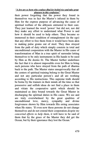 their power forgetting that the power they found in themselves was in fact the Master’s infused in them by Him for the express purpose of advancing the cause of spiritual welfare of the abhyasis entrusted to their care. They just learned the word ‘power’ but did not, nor did they make any effort to understand what Power is and how it should be used to help others. They became so immersed in their condition of entanglement (in the ego) that any effort to free them from it would have been akin to making pulse grains out of steel. They thus strayed from the path of duty which simply consists in total and unconditional cooperation with the Master in His cause of transformation of Man in a true spirit of surrender letting themselves to be only instruments in His hands to be used by Him as He deems fit. The Master further underlines the fact that it is almost impossible even for Him to bring such persons who have strayed from the path of dharma back to the path. The Master states unequivocally that all the centers of spiritual training belong to the Great Master and not any particular person’s and all are working according to His instructions. This supreme truth should be borne by the trainers in their minds all the time so that possessive and selfish ideas do not find a place in them and vitiate the cooperative spirit which should be maintained as duty bound towards the Great Master in discharging the spiritual duties in His cause. We see and are truly overwhelmed by the great qualities of unconditional love, mercy, sympathy and divine forgiveness shown by Him towards His erring associates when He states. ‘If even now these persons do not change themselves and do not extend their cooperation despite my concerted efforts to help them, it will have to be said of them that by the grace of the Master they did get the