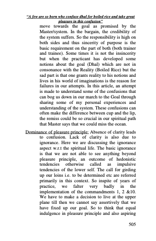 move towards the goal as promised by the Master/system. In the bargain, the credibility of the system suffers. So the responsibility is high on both sides and thus sincerity of purpose is the basic requirement on the part of both (both trainer and trainee). Some times it is not the insincerity but when the practicant has developed some notions about the goal (Dhal) which are not in consonance with the Reality (Boiled Rice) but the sad part is that one grants reality to his notions and lives in his world of imaginations is the reason for failures in our attempts. In this article, an attempt is made to understand some of the confusions that can bog us down in our march to the Goal through sharing some of my personal experiences and understanding of the system. These confusions can often make the difference between cup and the lip, the remiss could be so crucial in our spiritual path that Master says that we could miss the ocean.