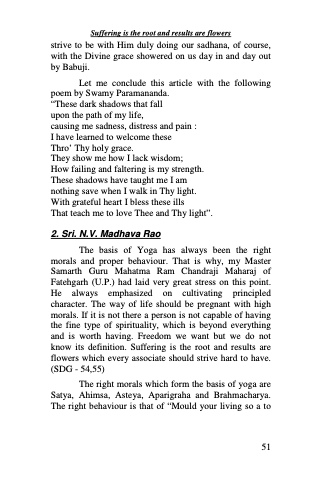 The basis of Yoga has always been the right morals and proper behaviour. That is why, my Master Samarth Guru Mahatma Ram Chandraji Maharaj of Fatehgarh (U.P.) had laid very great stress on this point. He always emphasized on cultivating principled character. The way of life should be pregnant with high morals. If it is not there a person is not capable of having the fine type of spirituality, which is beyond everything and is worth having. Freedom we want but we do not know its definition. Suffering is the root and results are flowers which every associate should strive hard to have. (SDG - 54,55)
