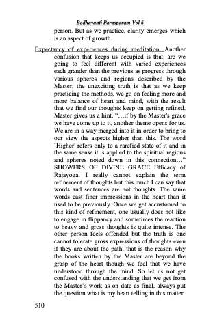 Expectancy of experiences during meditation: Another confusion that keeps us occupied is that, are we going to feel different with varied experiences each grander than the previous as progress through various spheres and regions described by the Master, the unexciting truth is that as we keep practicing the methods, we go on feeling more and more balance of heart and mind, with the result that we find our thoughts keep on getting refined. Master gives us a hint, “...if by the Master's grace we have come up to it, another theme opens for us. We are in a way merged into it in order to bring to our view the aspects higher than this. The word `Higher' refers only to a rarefied state of it and in the same sense it is applied to the spiritual regions and spheres noted down in this connection...” SHOWERS OF DIVINE GRACE Efficacy of Rajayoga. I really cannot explain the term refinement of thoughts but this much I can say that words and sentences are not thoughts. The same words cast finer impressions in the heart than it used to be previously. Once we get accustomed to this kind of refinement, one usually does not like to engage in flippancy and sometimes the reaction to heavy and gross thoughts is quite intense. The other person feels offended but the truth is one cannot tolerate gross expressions of thoughts even if they are about the path, that is the reason why the books written by the Master are beyond the grasp of the heart though we feel that we have understood through the mind. So let us not get confused with the understanding that we get from the Master’s work as on date as final, always put the question what is my heart telling in this matter.