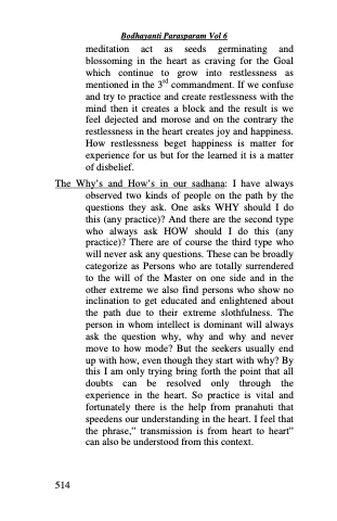 meditation act as seeds germinating and blossoming in the heart as craving for the Goal which continue to grow into restlessness as mentioned in the 3rd commandment. If we confuse and try to practice and create restlessness with the mind then it creates a block and the result is we feel dejected and morose and on the contrary the restlessness in the heart creates joy and happiness. How restlessness beget happiness is matter for experience for us but for the learned it is a matter of disbelief.