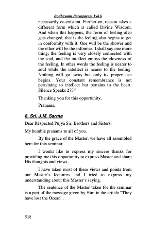 necessarily co-existent. Further on, reason takes a different form which is called Divine Wisdom. And when this happens, the form of feeling also gets changed; that is the feeling also begins to get in conformity with it. One will be the shower and the other will be the informer. I shall say one more thing; the feeling is very closely connected with the soul, and the intellect enjoys the closeness of the feeling. In other words the feeling is nearer to soul while the intellect is nearer to the feeling. Nothing will go away but only its proper use begins. Y our constant remembrance is not pertaining to intellect but pertains to the heart. Silence Speaks 273”